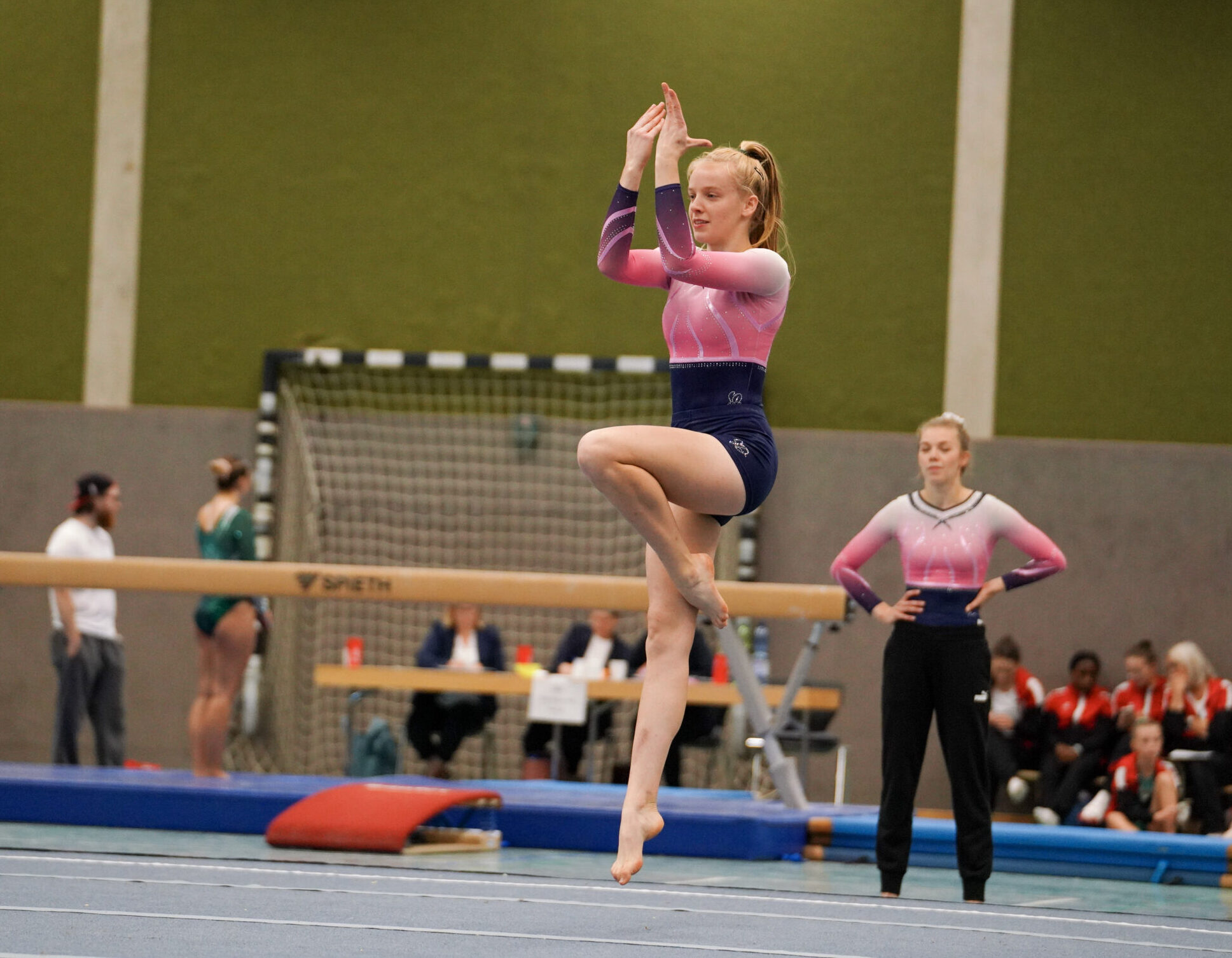 Gleich zum Auftakt setzte das Team aus Bad Iburg an ihrem traditionell stärksten Gerät ein Ausrufezeichen: Am Boden erturnten sie sich die meisten Punkte aller Mannschaften. Emily, Isabella und Aurelia konnten dazu in der Übung einen Schraubensalto zeigen, der mit 0,5 Bonuspunkten pro Übung belohnt wurde.
